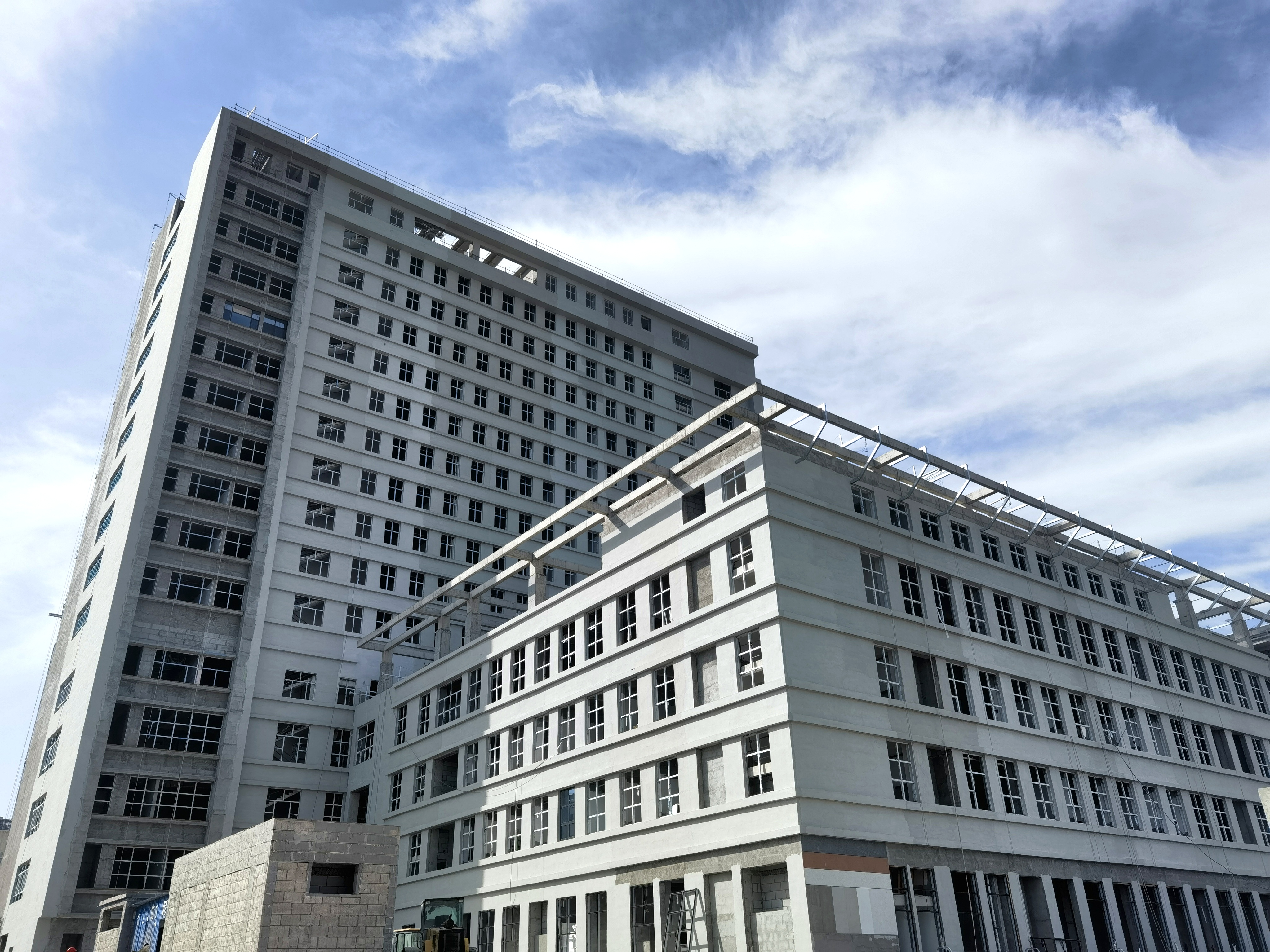甘肃省河西区域医疗中心建设项目目前已主体封顶,门诊楼外立面干挂幕墙龙骨安装,住院楼水包砂外墙完成80%,地暖施工完成,窗户安装完成60%。