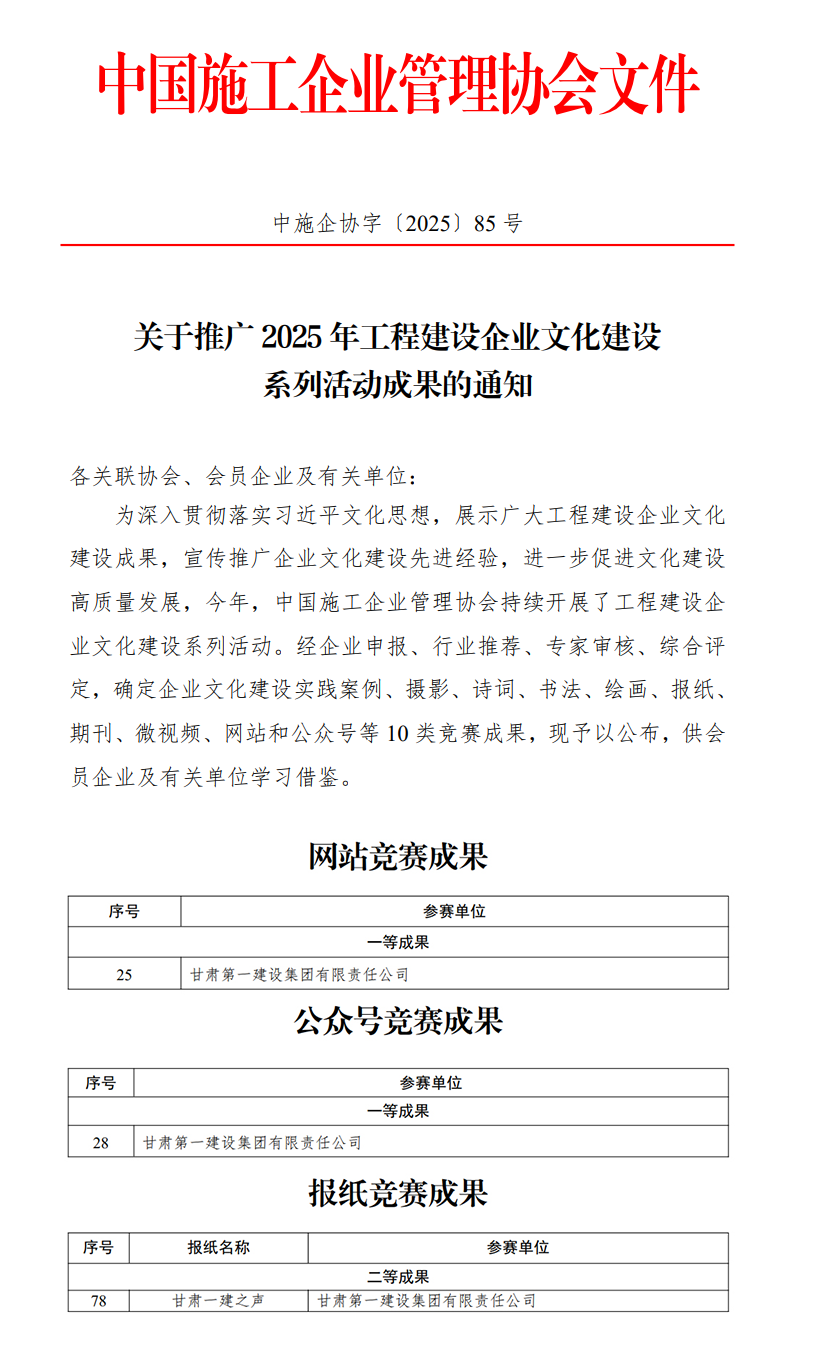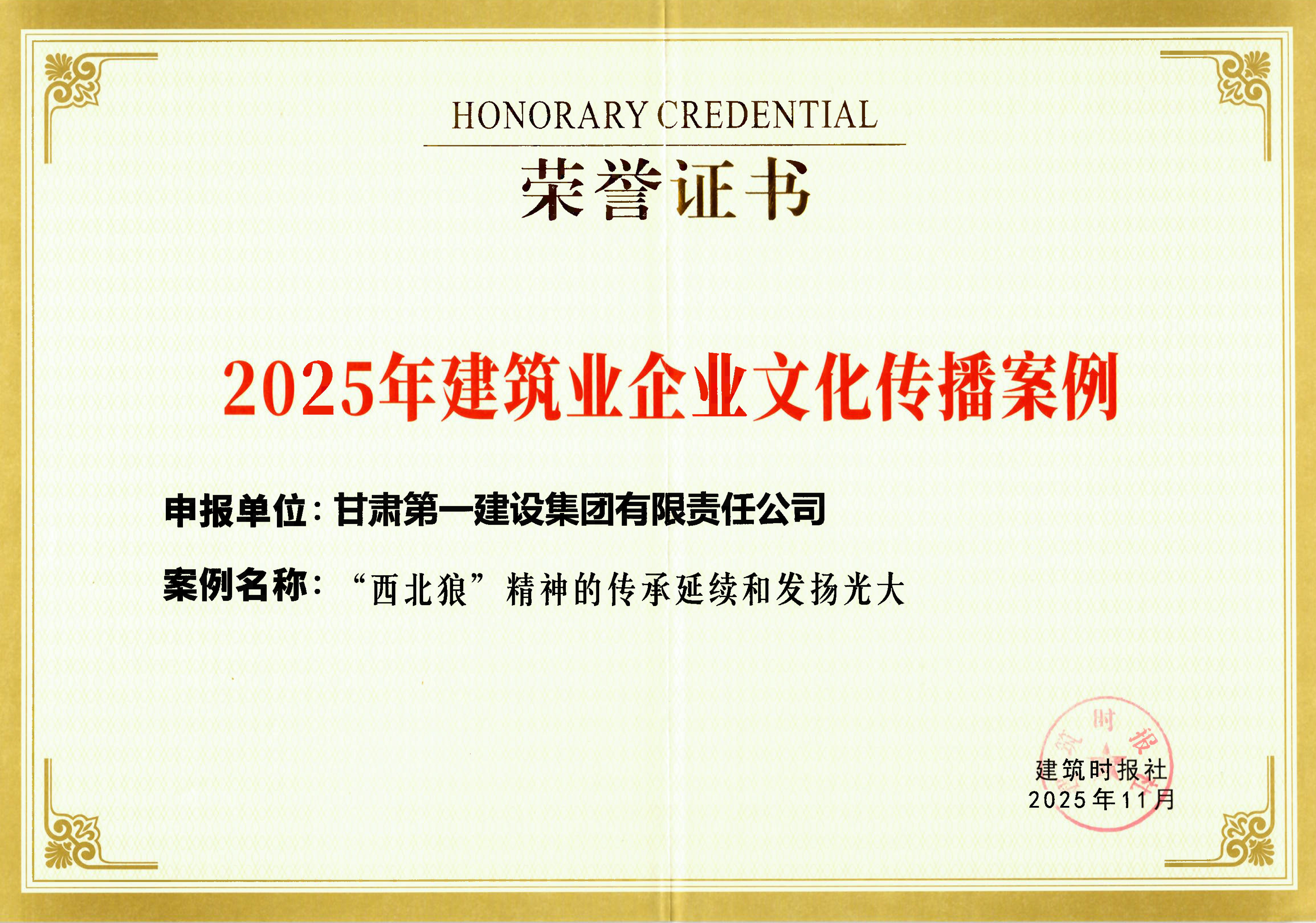 日前,建筑时报社《2025年建筑业企业文化传播案例》和中国施工企业管理协会2025年工程建设企业文化建设系列活动成果相继公布。 由甘肃建投一建公司报送的《“西北狼”精神的传承延续和发扬光大》成功入选“2025年建筑业企业文化传播案例”;运营的微信公众号“甘肃一建集团”、企业网站均获一等成果,企业内刊《甘肃一建之声》荣获二等成果,这是继微信公众号、视频号分获“全国建筑业优秀微信公众号、优秀微信视频号”荣誉后,企业文化建设获得的又一行业级肯定。 入选的案例以70余年企业发展为脉络,通过上海初创工程、“一五” 计划援建等具体实践,清晰呈现精神传承轨迹,更以鲁班奖等多项荣誉、灾后重建等社会责任践行,实现精神与发展的深度转化,精准全面地凝练了“西北狼”精神内核。作为对外推介形象,对内凝聚士气重要宣传载体的企业微信公众号、官方网站和企业内刊,始终聚焦“内容为王”的运营理念,紧密围绕企业中心工作,将重点聚焦在项目一线,用朴实无华的文字、独特视角的图片、视频等多种形式讲述普通职工的感人故事,受到社会各界和广大职工及家属的好评与喜爱,多年来获得诸多荣誉。其中,企业公众号更是连续六年在全国建筑业优秀公众号评选活动中获奖,《甘肃一建之声》被中国建筑施工企业管理协会评为2018年度全国工程建设行业报纸银页奖,全方位印证了公司在企业文化体系构建、多元传播渠道运营等方面的显著成效。多年来,公司持续深耕企业文化建设,全面准确总结、提炼企业文化建设成果,并通过公众号、网站、内刊等多元载体,策划推出了一系列主题鲜明、形式新颖、传播力强的优质内容,有效提升了企业的品牌美誉度与社会影响力。